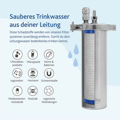So entsteht sauberes Trinkwasser! Die Filtereinheiten sollten ca. alle 6 Monate gewechselt werden. Den Filtereinsatz wĂ€hlst Du entsprechend Deiner BedĂŒrfnisse und bestellst den fĂŒr Dich Richtigen am besten gleich dazu