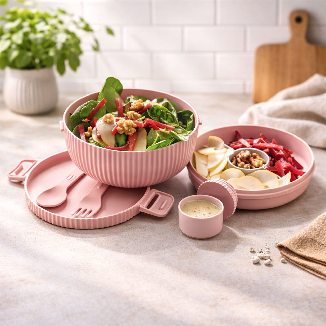 Mit ihren drei getrennten Fächern bleibt dein Essen appetitlich und sauber getrennt. Salat, Toppings, Snacks oder Dressing lassen sich übersichtlich verstauen. Der zusätzliche 35 ml Behälter eignet sich perfekt für Saucen oder Nüsse. Der Deckel mit praktischen Griffen sorgt für einfaches Öffnen und sicheres Verschließen, ideal für unterwegs.