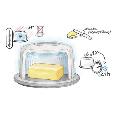 Die Anwendung ist denkbar einfach. Haube wässern, abtropfen lassen und über die Butter stellen. Je nach Raumklima bleibt die Butter über viele Stunden angenehm kühl und streichfähig. Das Design ist bewusst reduziert und fügt sich harmonisch in jede Küche ein.