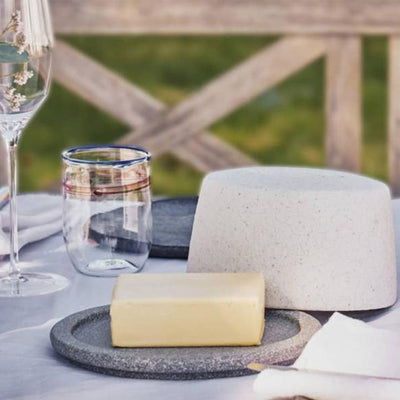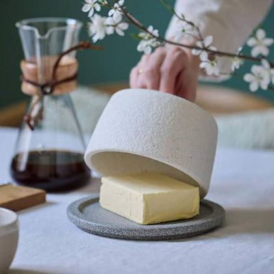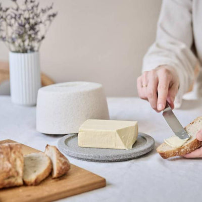 Der Butterkühler besteht aus zwei speziell entwickelten Keramiken. Die Porosium Keramik der Haube speichert Wasser und sorgt durch Verdunstung für natürliche Kühlung. Der Unterteller aus Granicium Keramik ist robust, langlebig und lebensmittelecht. Beide Materialien sind auf eine lange Nutzungsdauer ausgelegt und kommen ganz ohne Strom aus.
