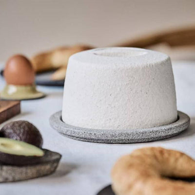 Mit dem Denk Keramik Butterkühler bleibt deine Butter frisch, aromatisch und jederzeit streichzart, ganz ohne Kühlschrank. Der zweiteilige Butterkühler kombiniert eine wasseraktive Haube aus patentierter Porosium Keramik mit einem stabilen Unterteller aus Granicium Keramik. Gemeinsam nutzen sie das natürliche Prinzip der Verdunstungskälte und schaffen ideale Lagerbedingungen direkt auf deinem Tisch.