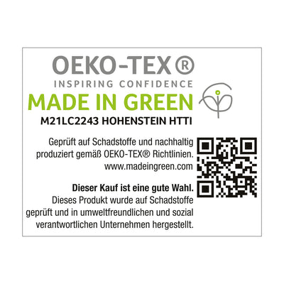 Die Matratzenauflagen werden in einem klimaneutralen Unternehmen in Deutschland produziert. Das nachverfolgbare Label MADE In GREEN by OEKO-TEX schenkt Dir die nötige Transparenz. Du kannst Dir also sicher sein, dass alle Produkte, die dieses Siegel tragen