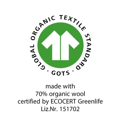 GOTS zertifiziert - made with 70% organic wool - zertifiziert von ECOCERT Greenlife, Lizenznummer: 151702