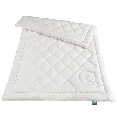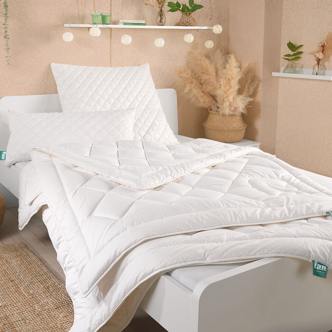 Bezugsstoff und Fülung bestehen aus Baumwolle. Diese ist aus kontrolliert biologischem Anbau (kbA) und obendrein streng auf Schadstoffe getestet. Die Baumwolle ist äußerst atmungsaktiv, weich und angenehm zur Haut. Sie kann bis zu 60% ihres Eigengewichts an Feuchtigkeit aufnehmen. Damit baut diese Decke ein Schlafklima auf, das trocken und angenehm auf der Haut wirkt.