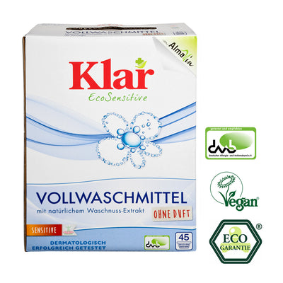 Das Vollwaschmittel enthält alle Substanzen, die für eine reine Wäsche notwendig sind. Sie benötigen keine Zusatzstoffe wie Enthärter und Bleichmittel, da sie schon enthalten sind. Ideal also für farbechte Buntwäsche und alles Weiße bei allen Wasserhärten. Dermatologisch erfolgreich getestet und empfohlen vom Deutschen Allergie- und Asthmabund. Alternativ empfehlen wir das KLAR-Baukasten-System. KLAR-Produkte sind leistungsstarke Öko-Konzentrate ohne Füllstoffe und sind daher sehr ergiebig. Verwendet werden ausschließlich biologisch abbaubare Tenside, die in Gewässern schnell und vollständig abbaubar sind.