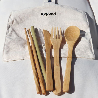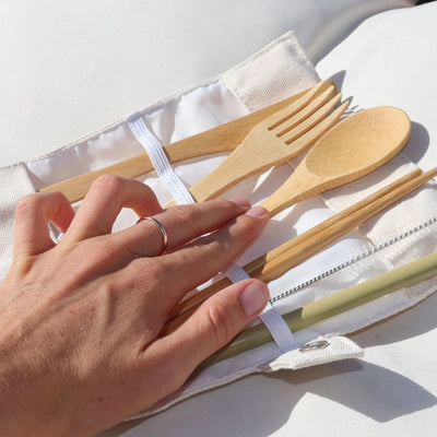 Hübsch und gut durchdacht: Alles was Du brauchst kommt sicher verpackt in einer passenden Tasche - natürlich aus 100% Bio Baumwolle. Damit bleibt Dein Set aus Bambus Messer, Bambus Gabel, Bambus Löffel, Ess-Stäbchen, Bambus Strohhalm und Reinigungsbürste immer komplett.