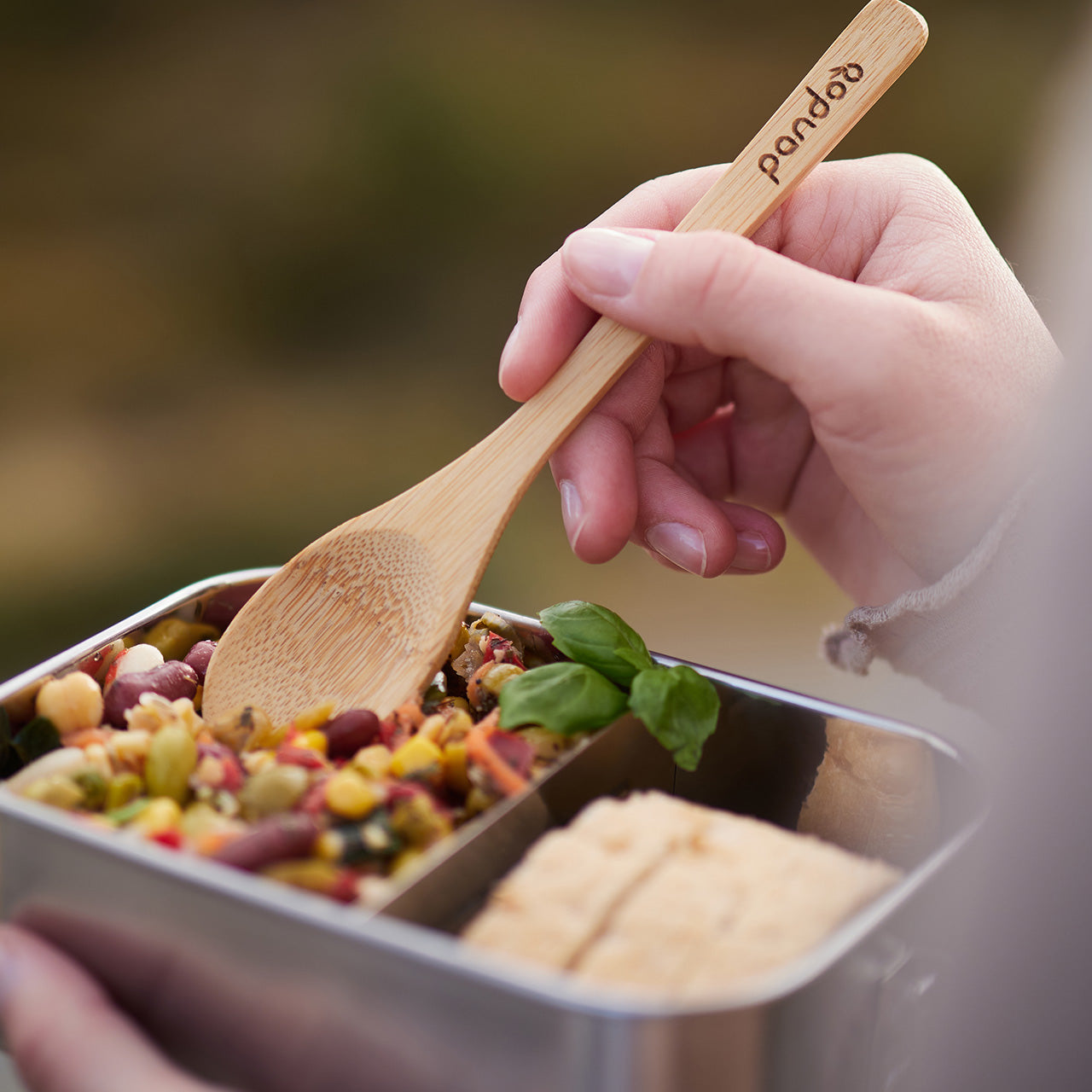 Praktisch und gut: Alles was Du brauchst um draußen zu Speisen gibt es auch in Mehrweg. Das Besteck ist umweltfreundlich aus Bambus gefertigt und nicht lasiert. Es sieht nicht nur gut aus, sondern verzeiht Dir auch problemlos einen Sturz vom Tisch.