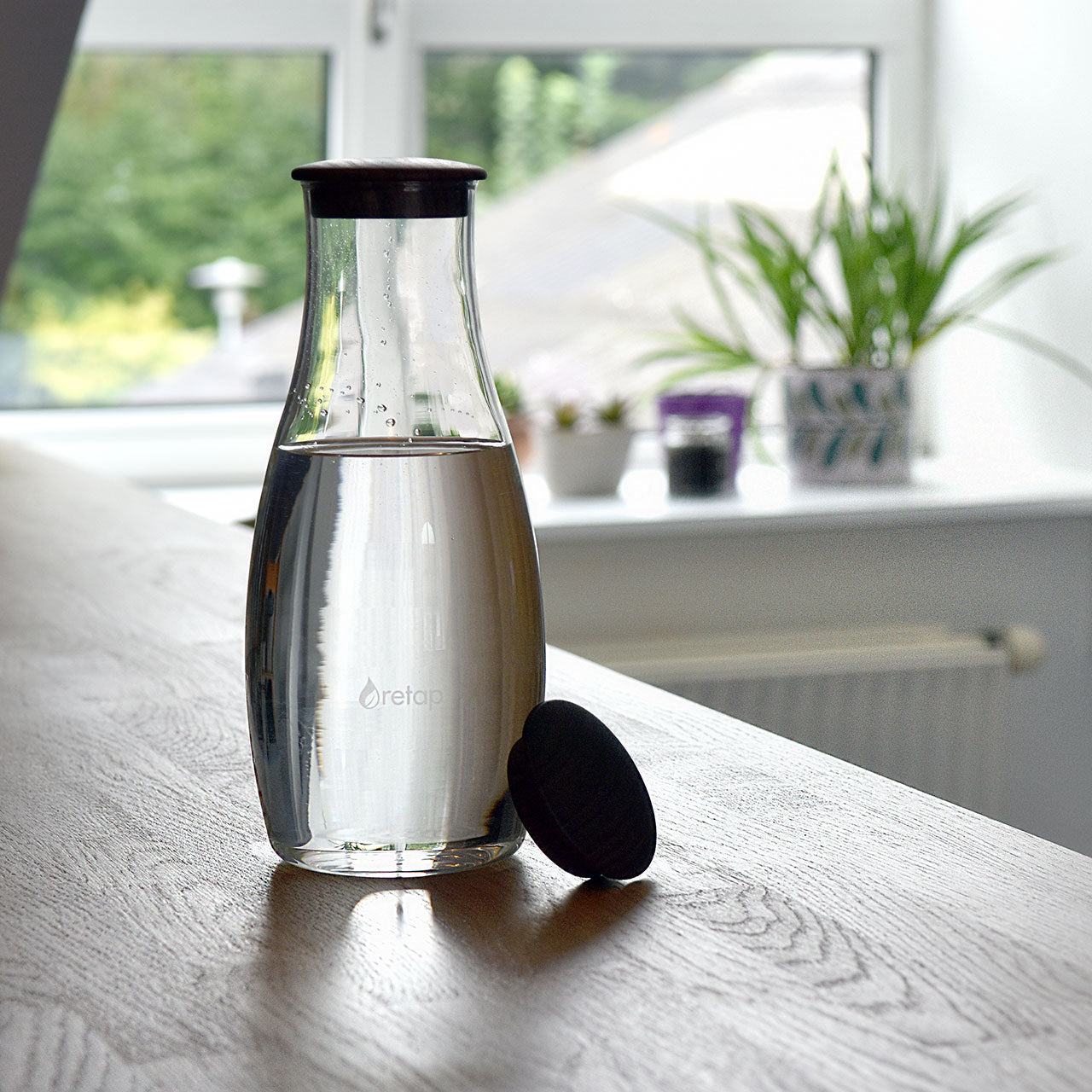 Wichtig: Der Deckel bietet keinen Auslaufschutz! Die Karaffe ist nicht fĂŒr unterwegs konzipiert â entscheide dich hier lieber fĂŒr eine Retap-Trinkflasche (verfĂŒgbar mit einem Volumen von 0,8 Litern oder 0,5 Litern).