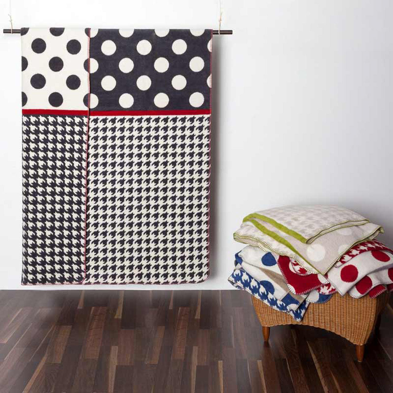 Decke mit geometrischem, grafischem Muster, auf farbigem Grund. Schadstoffgeprüftes Produkt in Naturqualität. Die zweiseitige Wohndecke ist aus 100% kbA Bio Baumwolle hergestellt. Auch für hautempfindliche und allergieanfällige Menschen geeignet.