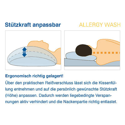 Für gesunden, reizarmem Schlaf sind pflegeleicht waschbare Bettwaren für Allergiker erforderlich. Nur durch die regelmäßige Wäsche bei über 60°C können Milben eliminiert und allergieauslösende Partikel aus den Textilien entfernt werden. Das speziell für Allergiker entwickelte Kopfkissen Allergy Wash ist hoch waschbeständig und bleibt auch nach vielen Wäschen formstabil. Die verwendeten Materialien sind schadstoffgeprüft, der Kissenbezug ist dermatologisch auf einwandfreie Hautverträglichkeit getestet. Das flauschige Kissen passt sich dem Nackenbereich ideal an und kann über den praktischen Reißverschluss auf den persönlichen Stützbedarf angepasst werden.