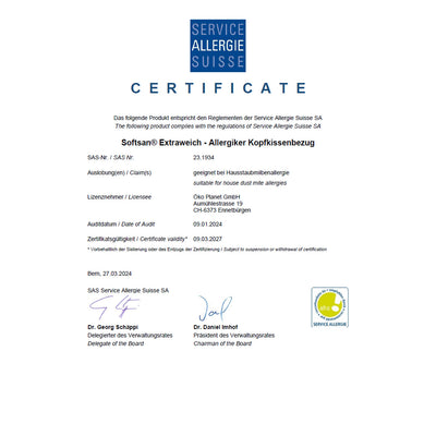 - Von unabhängigen Instituten getestet & bestätigt: Die allergendichte Barrierewirkung und die Eignung für Allergiker wurden vom Hohenstein Institut (Hausstaub- und Milbenbarriere) sowie dem aha! Allergiezentrum Schweiz geprüft. Die Materialqualität und Hautverträglichkeit wurden durch die FKT (medizinisch getestet, schadstoffgeprüft) sowie OEKO-TEX® (MADE IN GREEN / STANDARD 100, Klasse 1) bestätigt.
