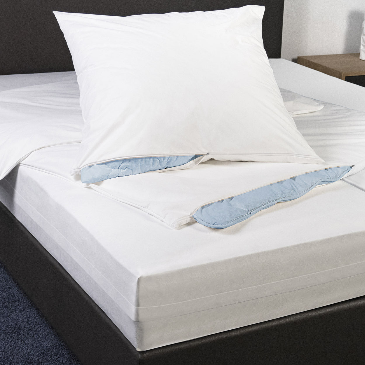 Die Bezüge fühlen sich von Anfang an weich und glatt an - ganz ohne vorheriges Waschen. Sie sind geräuschlos, atmungsaktiv und sorgen für ein ruhiges, natürliches Schlafklima. Matratze, Kissen und Bettdecke werden vollständig umhüllt und mit einem feinen, verdeckten Reißverschluss sicher verschlossen. Darüber kommt wie gewohnt Deine Bettwäsche - so bleibt Dein Schlafgefühl natürlich, nur eben hygienischer und allergenfrei.