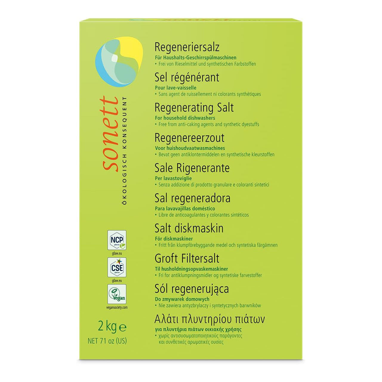 Salz für die Spülmaschine, für strahlend schönes Geschirr. Gute Reinigungskraft, die verwendeten Inhaltsstoffe sind 100% biologisch abbaubar und sind auf pflanzlicher, mineralischer Basis somi aus nachwachsenden Rohstoffen hergestellt.