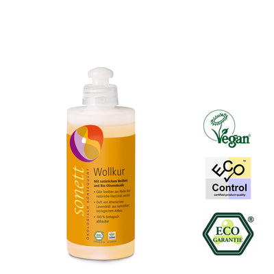 Die Wollkur gibt stark beanspruchten Textilien aus Wolle ihre natürliche Elastizität zurück. Auch für Wollwickelhosen und Windeln gut geeignet, da das natürliche Wollfett die Nässe des Windelpakets abfangen kann und trotzdem luftdurchlässig ist. Das verwendete Wollfett hat Arzneibuchqualität. Durch die Olivenölseife ist das Wollpflegemittel auch bei hartem Wasser problemlos anzuwenden.