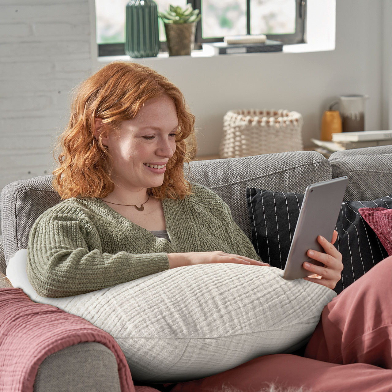 Der Bezug lässt sich unkompliziert abnehmen und bei 60 °C waschen. Damit bleibt das Kissen hygienisch sauber und jederzeit einsatzbereit.