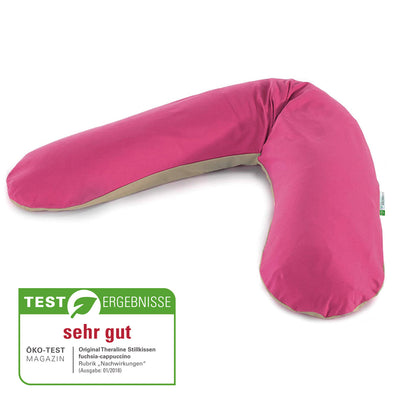 Das Original Theraline Stillkissen wurde von Öko-Test mit „sehr gut“ (Ausgabe 01/20218 - Rubrik "Nachwirkungen" - Farbe: fuchsia-cappuccino) bewertet und überzeugt auf ganzer Linie mit einem durchdachten Produktkonzept, von dem Schwangere, junge Mütter und Babys profitieren. Das Kissen hat eine Länge von insgesamt 190 cm und ist 38 cm breit. Es ist mit geräuscharmen Mikroperlen gefüllt, welche sich der Körperposition perfekt anpassen und dadurch höchste Flexibilität ermöglichen. Der Kissenbezug aus Bio-Baumwoll-Jersey hat einen langen und verdeckten Reißverschluss. Der Bezug kann dementsprechend ganz einfach ab- und wieder bezogen werden, so dass einer regelmäßiger Reinigung nichts mehr im Wege steht. Das Stillkissen samt Füllung kann komplett bei 60 Grad in der Waschmaschine gereinigt und anschließend im Trockner getrocknet werden. Bei Bedarf kannst du Mikroperlen durch die praktische Tunnelöffnung nachfüllen.