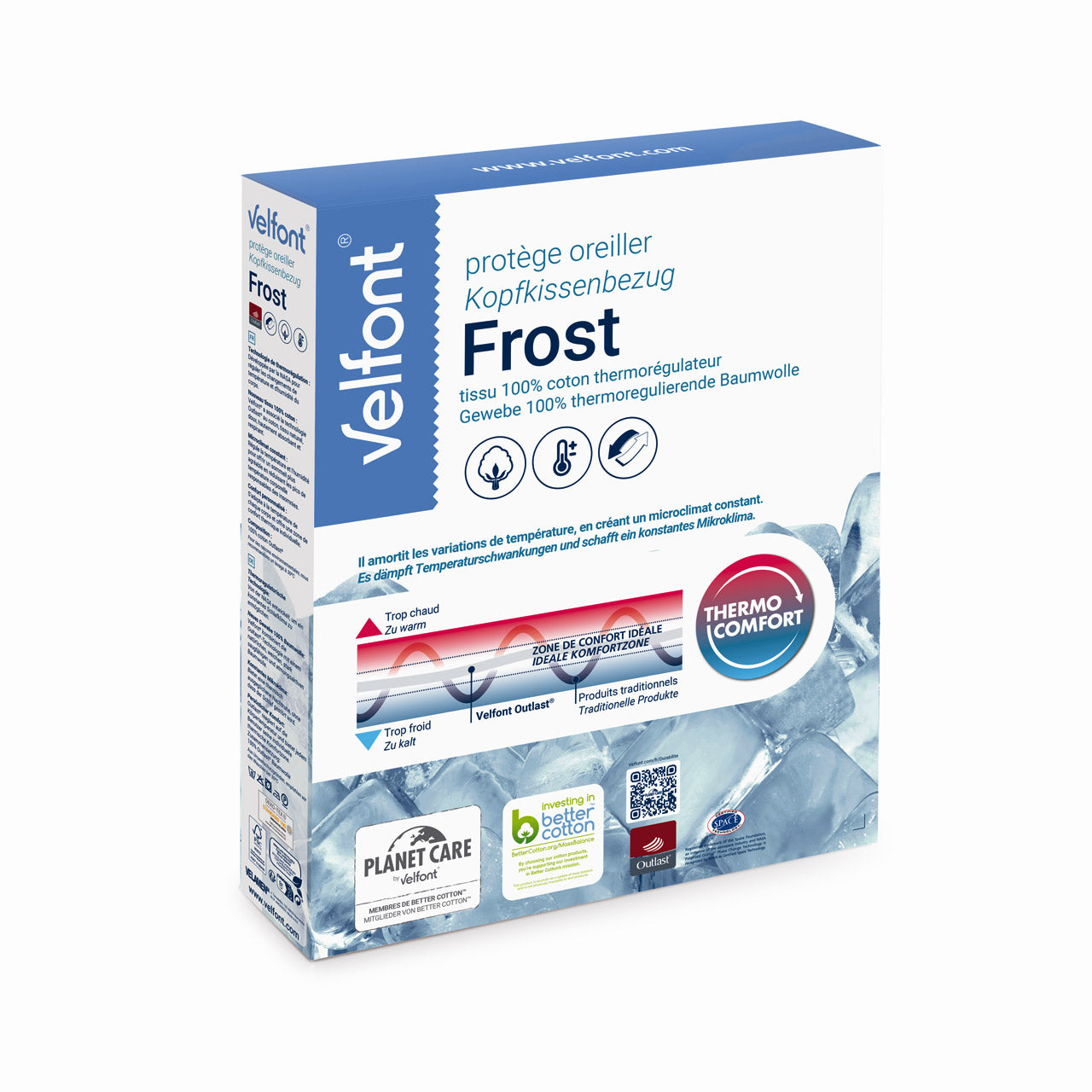 Der Velfont® Kissenbezug Thermo Comfort Frost besteht aus hochwertiger Outlast® Baumwolle. Dieses Material zeichnet sich durch seine kühlenden Eigenschaften aus, sodass du auch in heißen Nächten angenehm schlafen kannst. Die Baumwolle ist natürlich, weich und zugleich stark saugfähig, um überschüssige Feuchtigkeit effektiv aufzunehmen und ein angenehmes Schlafklima zu schaffen.