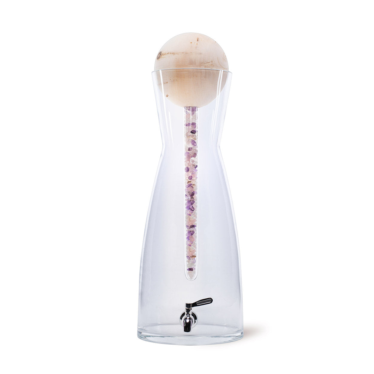 Gehaltvolles, frisches Wasser ist längst keine Selbstverständlichkeit, beim „Glungezer Riese“ Set allerdings schon! Das Set besteht aus einer großen Wasserkaraffe, die durch ein Fassungsvolumen von 9 Liter beeindruckt. Der dazugehörige Edelsteinstab ist aus hochwertigem Spezialglas gefertigt, das mit drei Edelsteinsorten (Bergkristall, Rosenquarz und Amethyst) gefüllt ist. An der Spitze des Stabs befindet sich eine ZirbenFamilie Zirbenkugel in einer Größe von 145 mm. Die Kugel aus naturbelassenem Zirbenholz verströmt nicht nur einen angenehm würzig-aromatischen Duft, sondern dient auch dazu, die Öffnung der Wasserkaraffe zu verschließen und damit sicherzustellen, dass das Wasser frisch bleibt. Das Wasser wird durch die im Stab enthaltenen Edelsteine mit Mineralien und Spurenelementen versorgt. Dieses sogenannte Edelsteinwasser leistet einen Beitrag zu einem besseren Wohlgefühl im Alltag.
